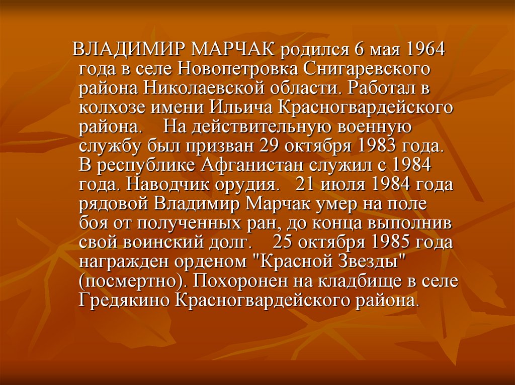 ВЛАДИМИР МАРЧАК родился 6 мая 1964года в селе Новопетровка Снигаревского