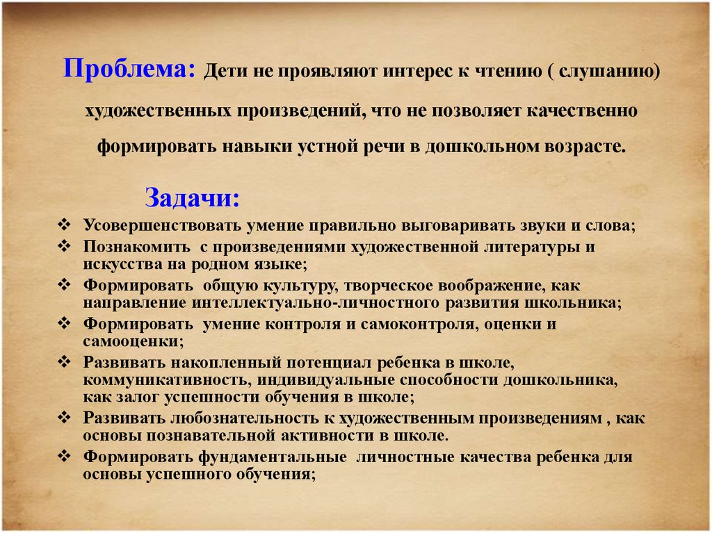 Проблема: Дети не проявляют интерес к чтению ( слушанию)художественных произведений, что не позволяет качественно
