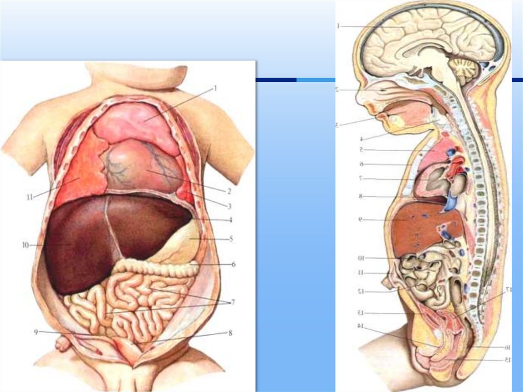 сагиттальной плоскости переходят во фронтальную. Печень отклоняется кверху.