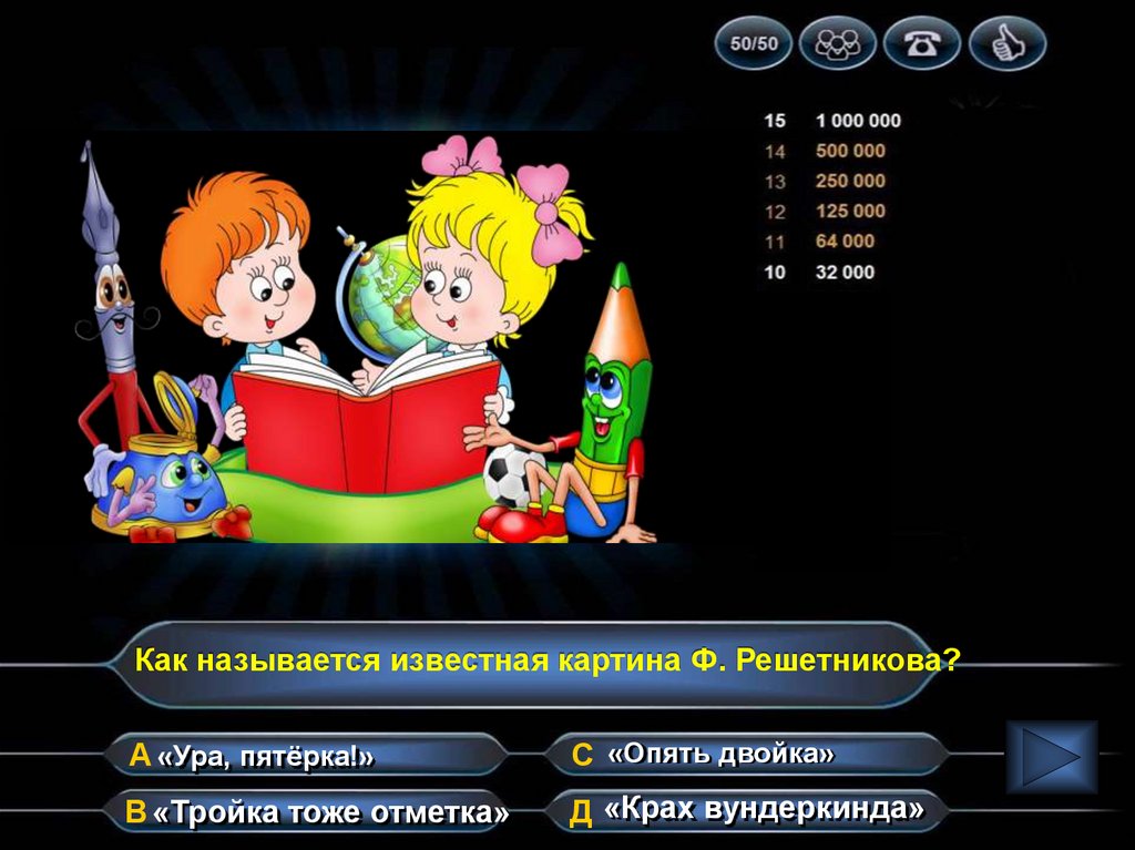 Как называется известная картина Ф. Решетникова?А «Ура, пятёрка!»