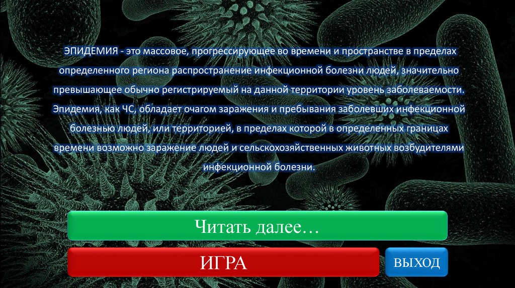 ЭПИДЕМИЯ - это массовое, прогрессирующее во времени и пространстве в пределахопределенного региона распространение инфекционной болезни людей, значительно