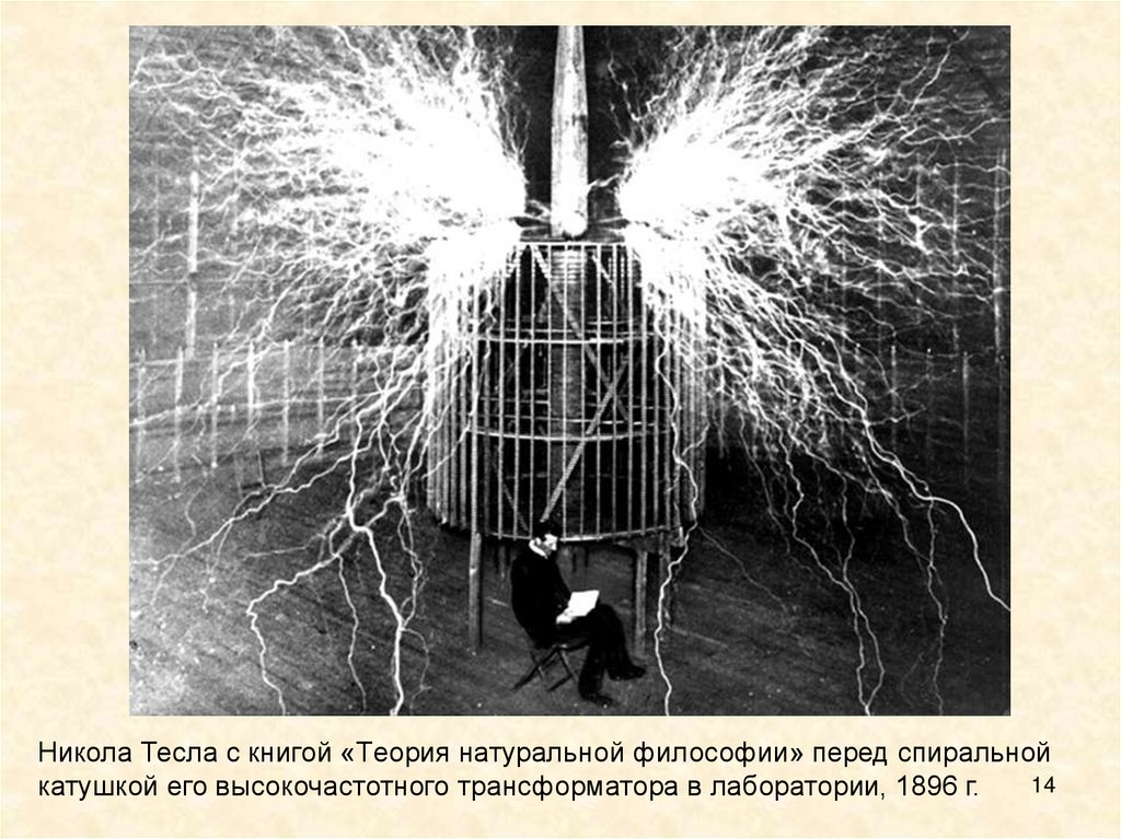 Никола Тесла с книгой «Tеория натуральной философии» перед спиральной14