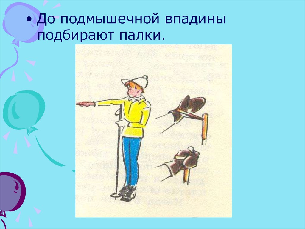 • Подбор лыж осуществляется надлину вытянутой руки.