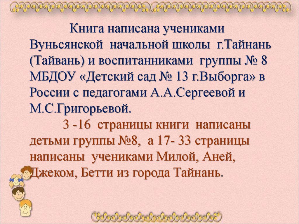 Книга написана ученикамиВуньсянской начальной школы г.Тайнань