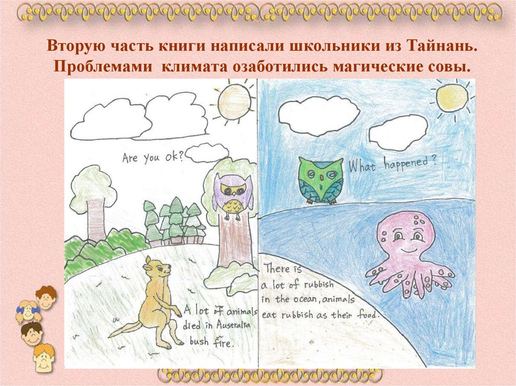 Вторую часть книги написали школьники из Тайнань.Проблемами климата озаботились магические совы.