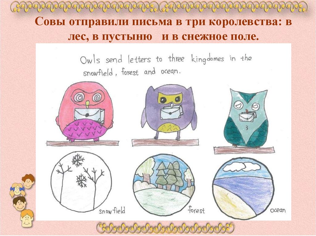 Совы отправили письма в три королевства: влес, в пустыню и в снежное поле.