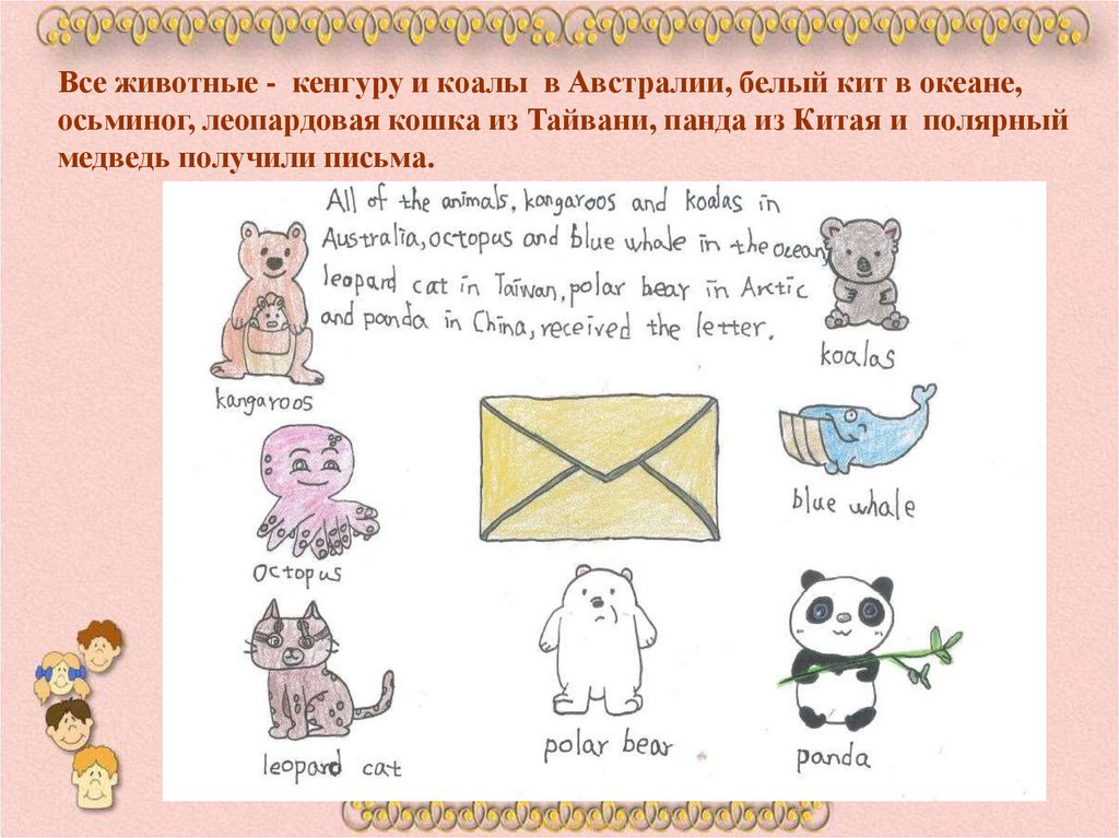 Все животные - кенгуру и коалы в Австралии, белый кит в океане,осьминог, леопардовая кошка из Тайвани, панда из Китая и полярный