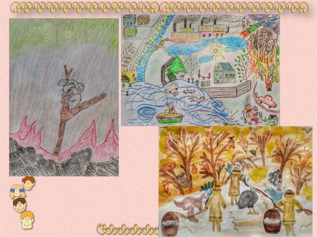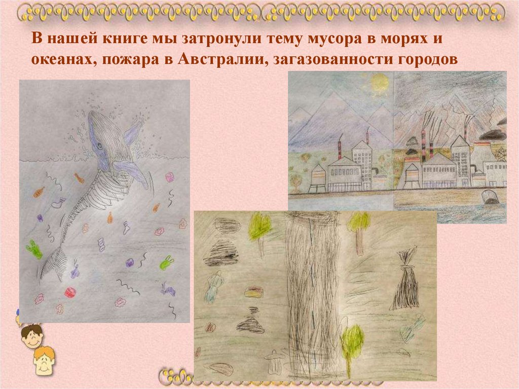В нашей книге мы затронули тему мусора в морях иокеанах, пожара в Австралии, загазованности городов