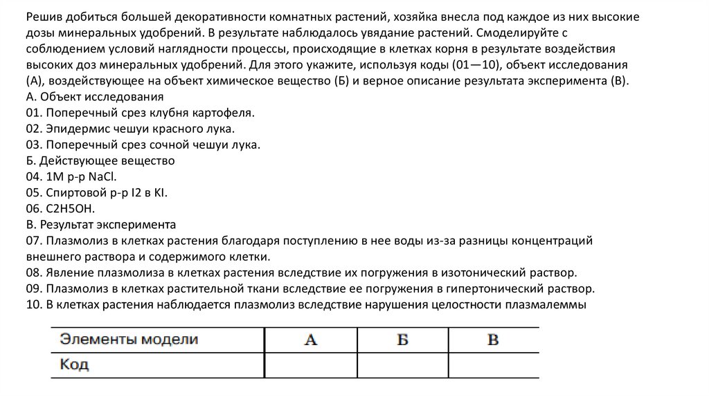 высоких доз минеральных удобрений. Для этого укажите, используя коды (01—10), объект исследования