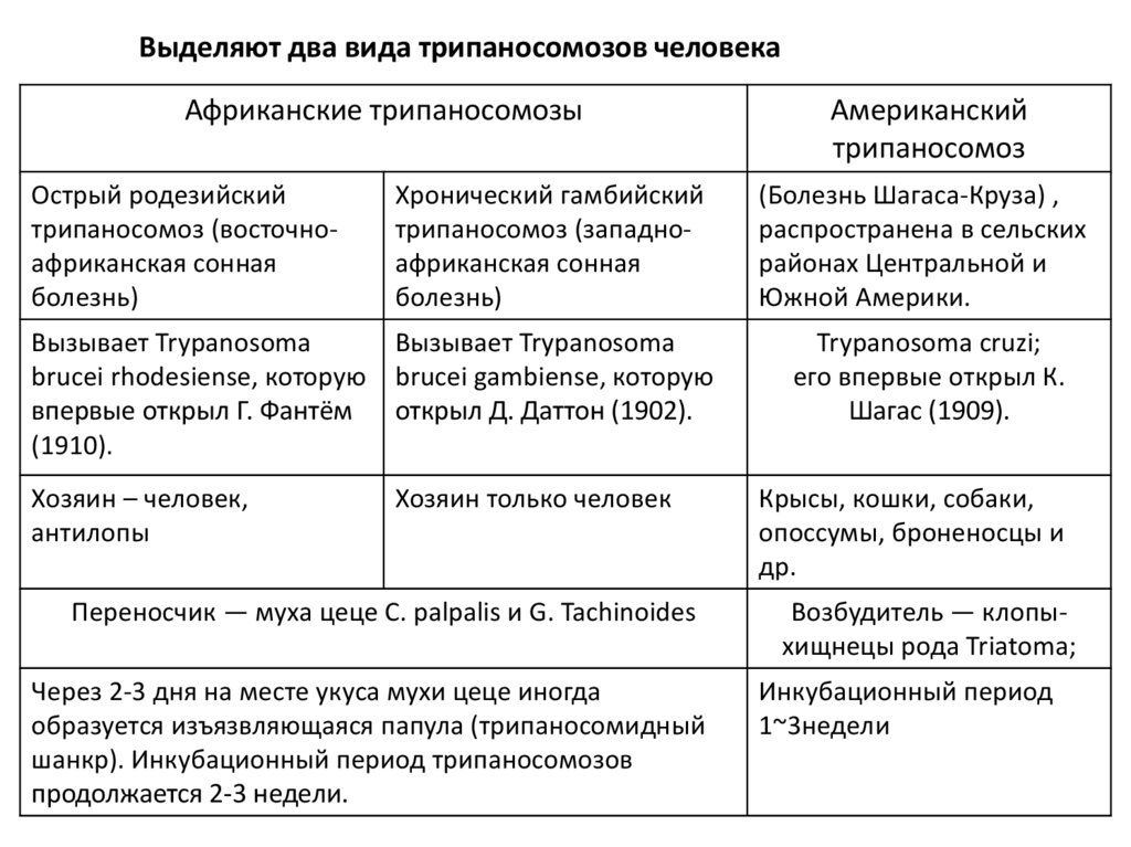 Выделяют два вида трипаносомозов человекаАфриканские трипаносомозы