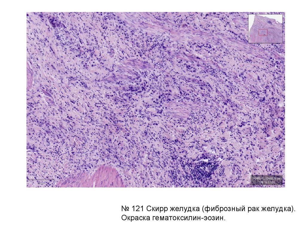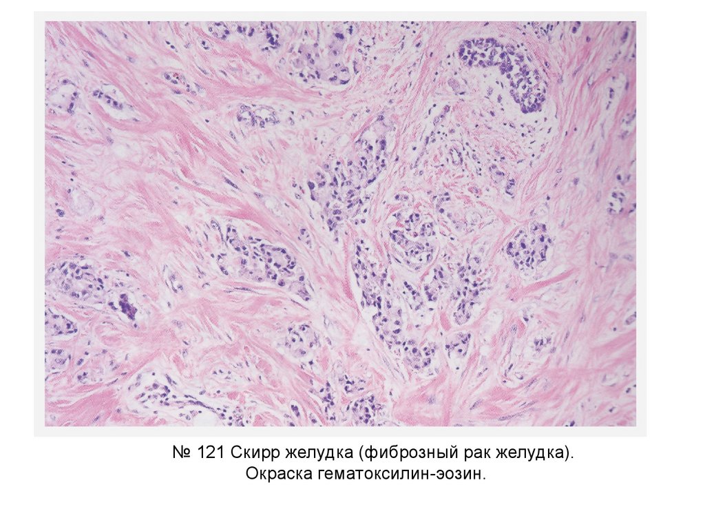 № 121 Скирр желудка (фиброзный рак желудка).Окраска гематоксилин-эозин.
