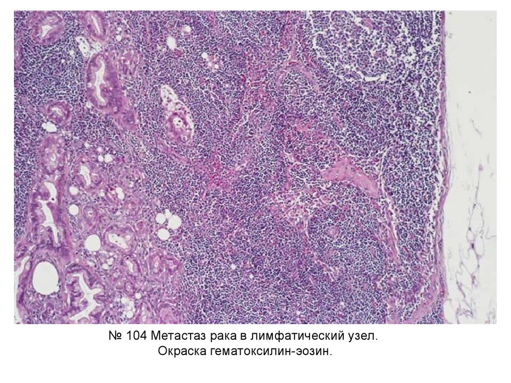 № 104 Метастаз рака в лимфатический узел.Окраска гематоксилин-эозин.