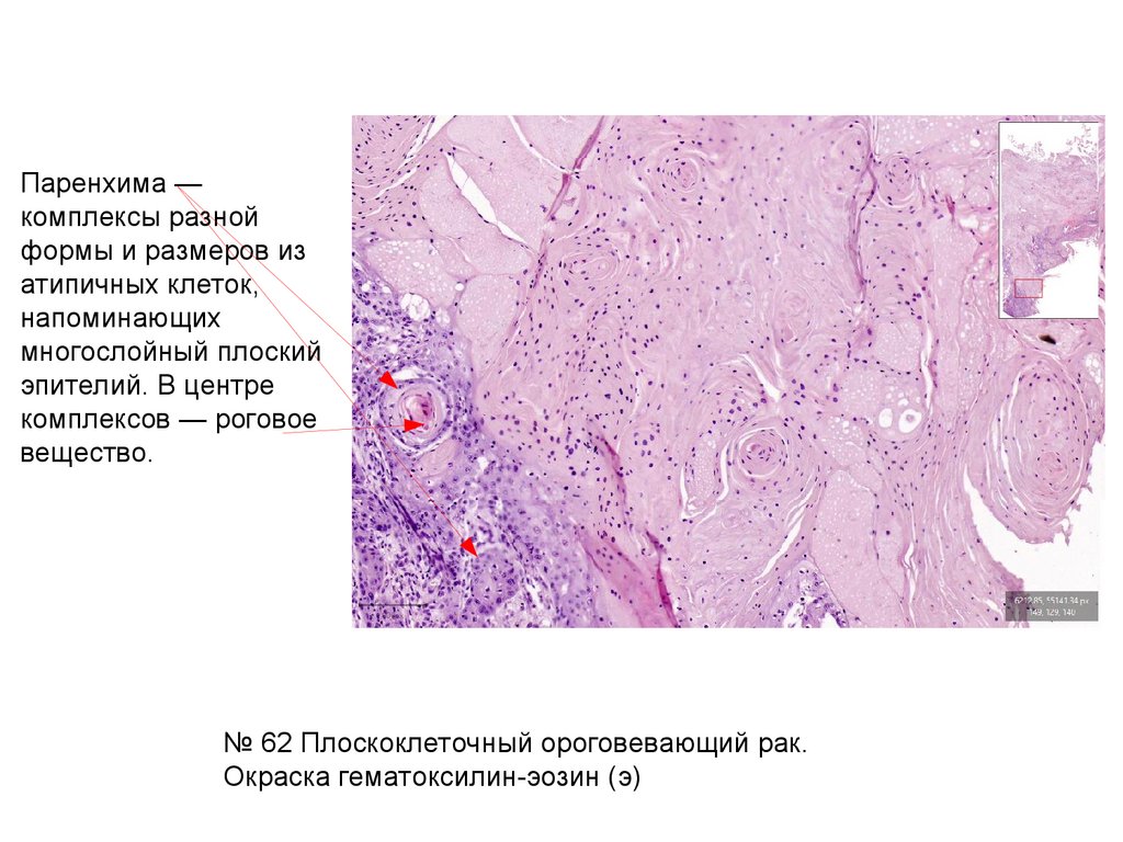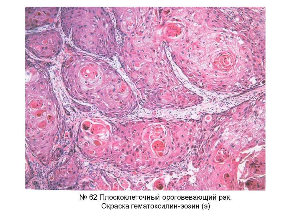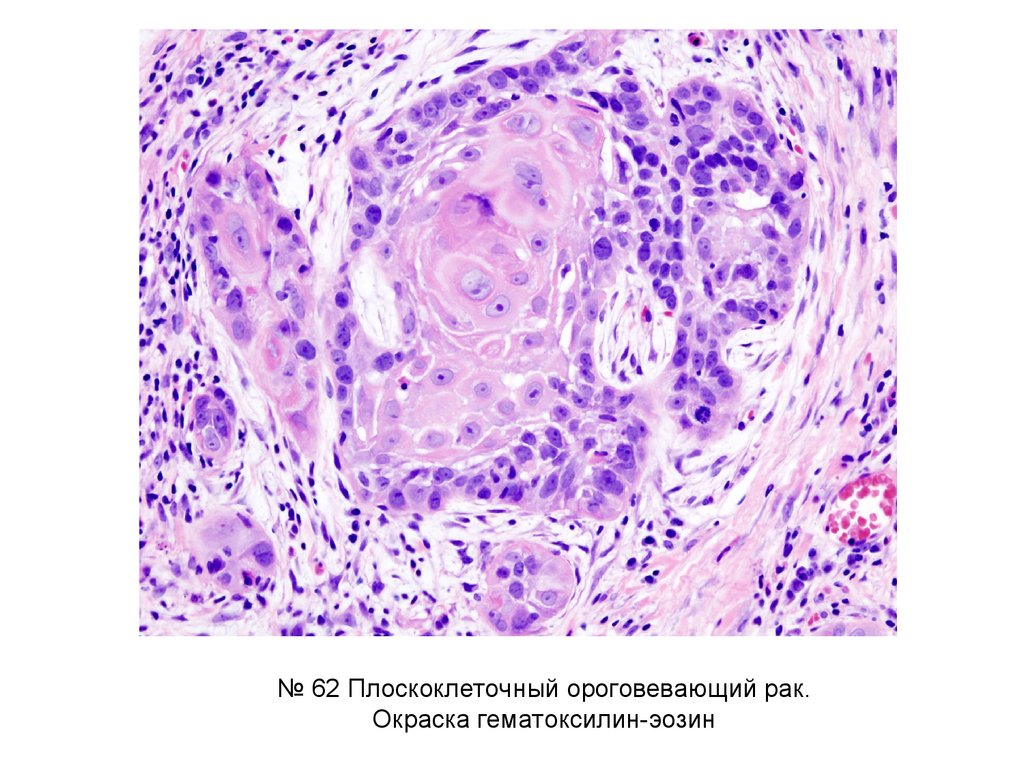 № 62 Плоскоклеточный ороговевающий рак.Окраска гематоксилин-эозин (э)