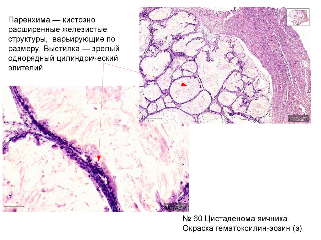 № 60 Цистаденома яичника.Окраска гематоксилин-эозин (э)