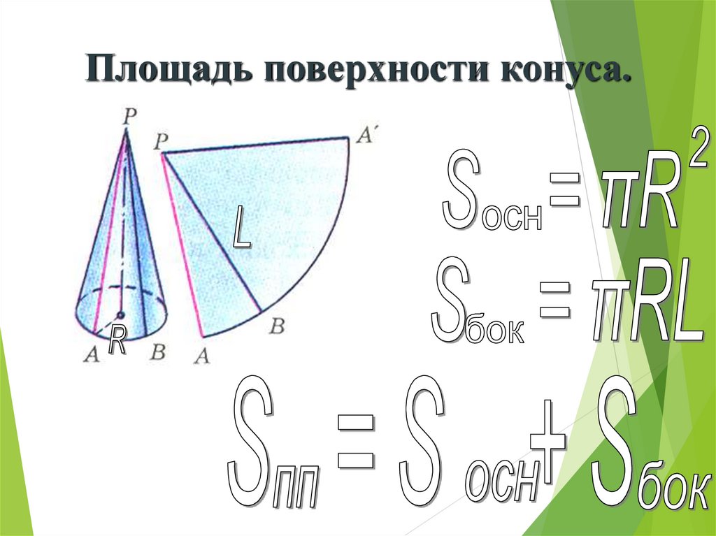 Площадь поверхности конуса.5. Площадь поверхности усеченного конуса.