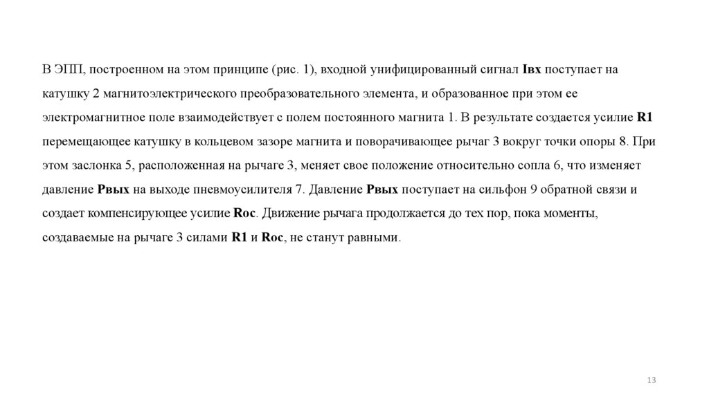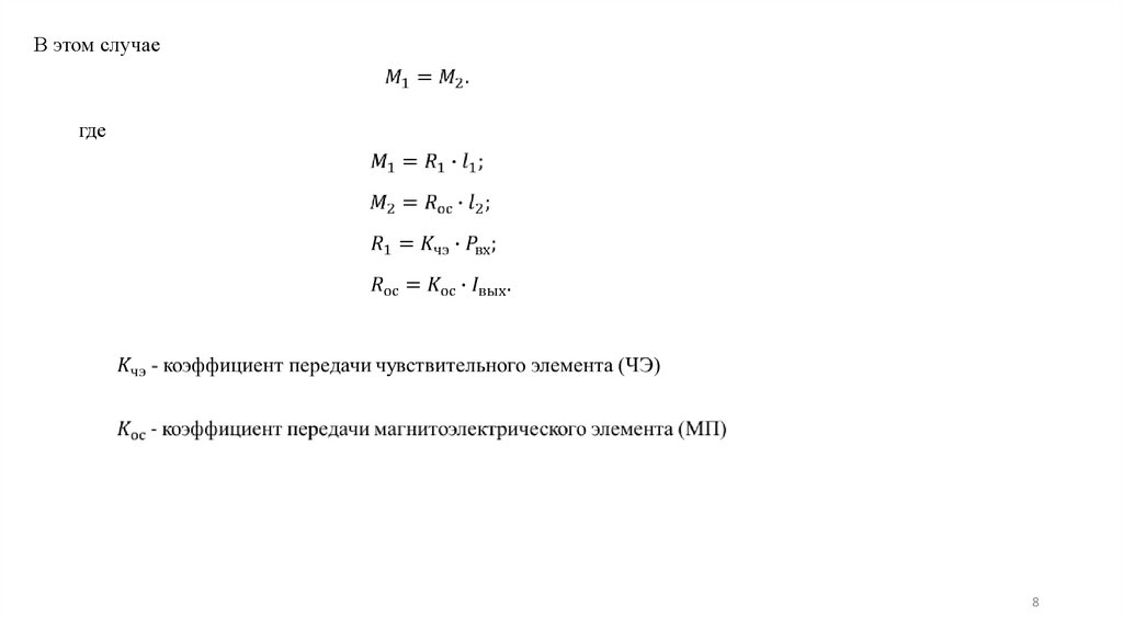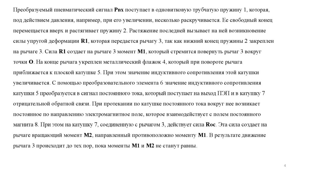 магнита 8. При этом на катушку 7, соединенную с рычагом 3, действует сила Rос. Эта сила создает на