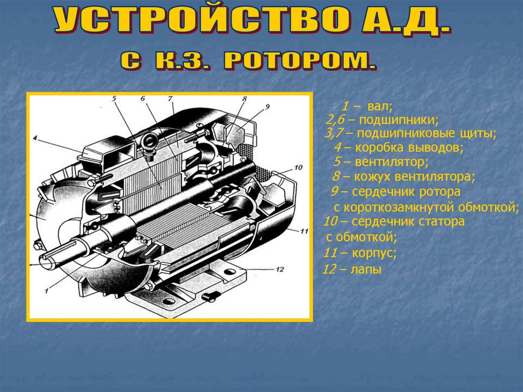 1,7 – подшипники; 2,6 – подшипниковые щиты; 3 – корпус; 4 – сердечник статора с обмоткой;5 – сердечник ротора; 8 – вал; 9 – коробка выводов; 10 – лапы; 11 – контактные кольца