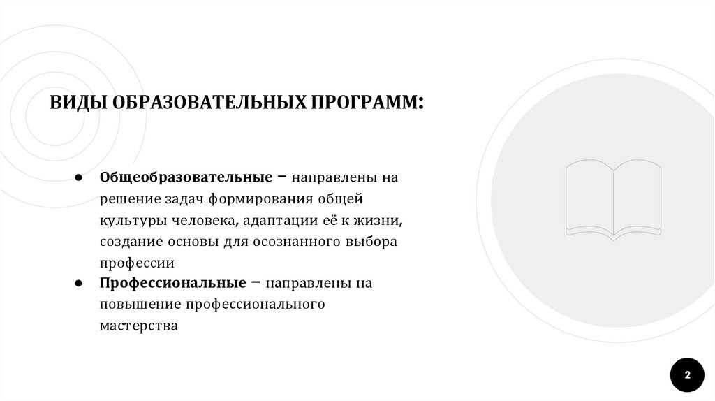 ВИДЫ ОБРАЗОВАТЕЛЬНЫХ ПРОГРАММ:Общеобразовательные – направлены на