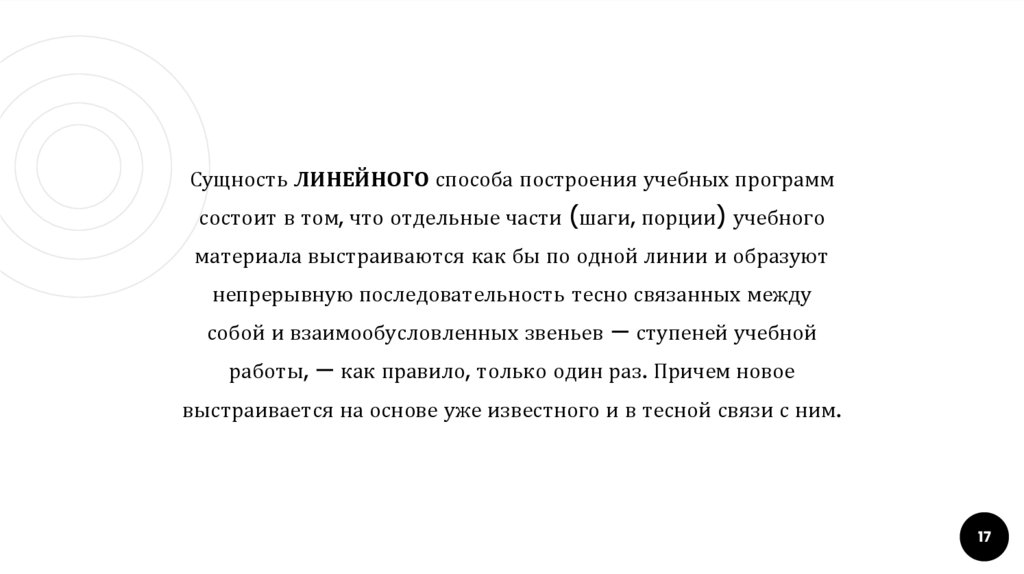 Сущность ЛИНЕЙНОГО способа построения учебных программсостоит в том, что отдельные части (шаги, порции) учебного