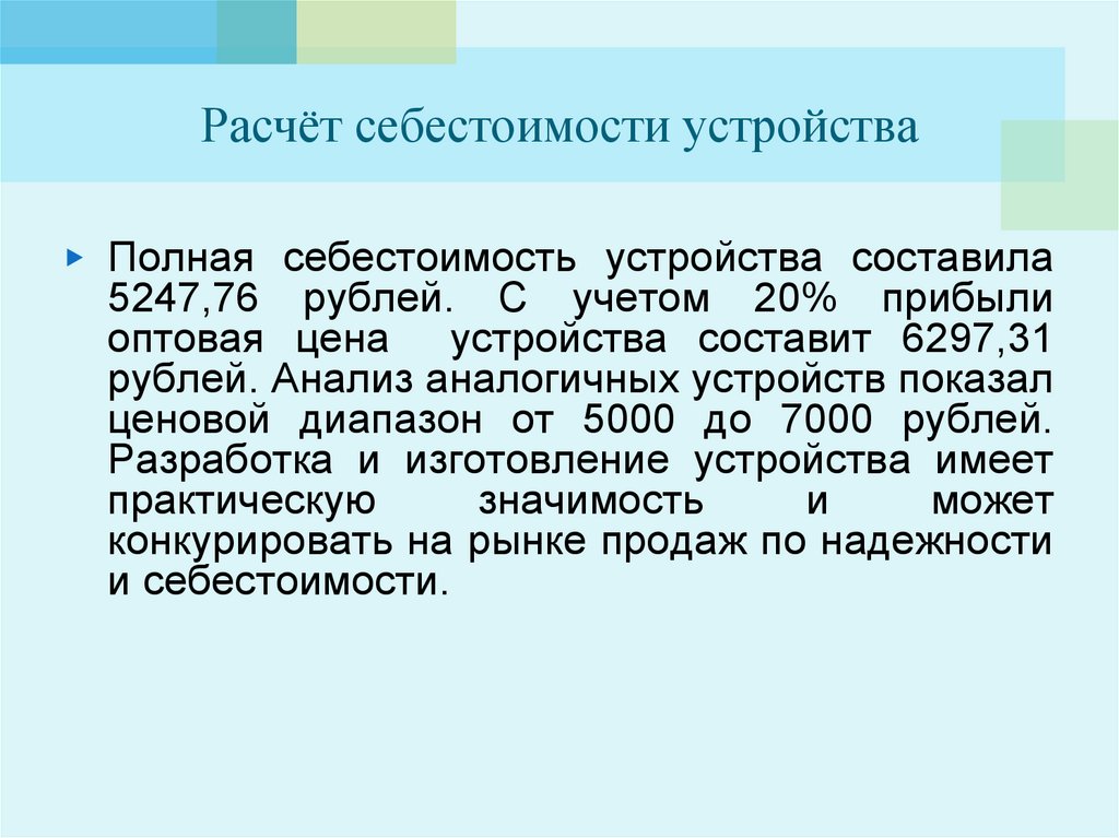 Расчёт себестоимости устройства▶ Полная себестоимость устройства составила