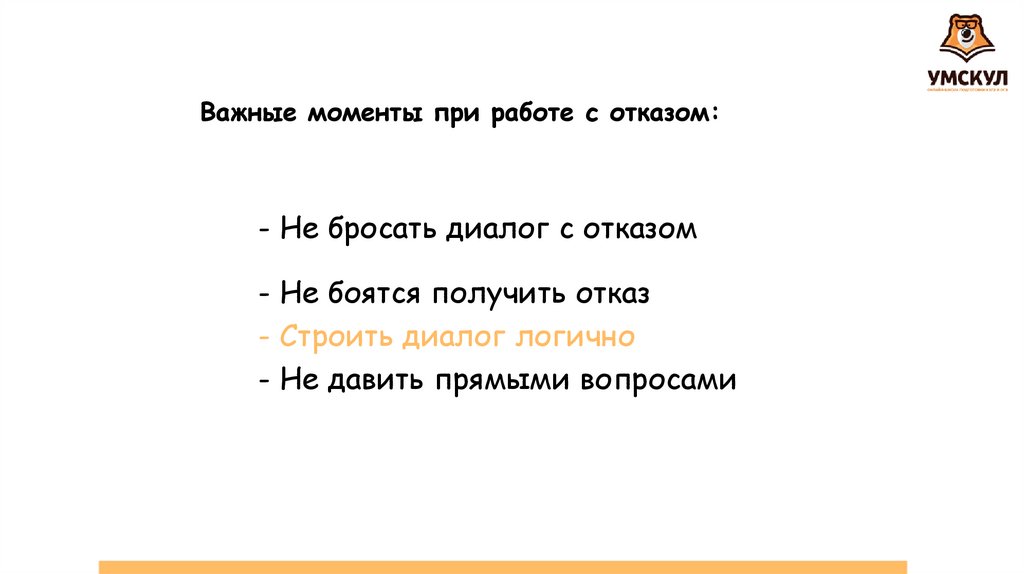 Важные моменты при работе с отказом:- Не бросать диалог с отказом