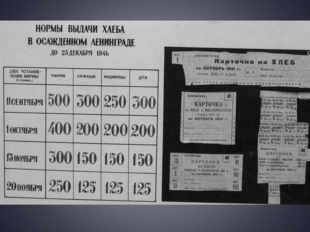 С ноября 1941 г. Норма выдачи хлебасокращается, а с декабря в городе