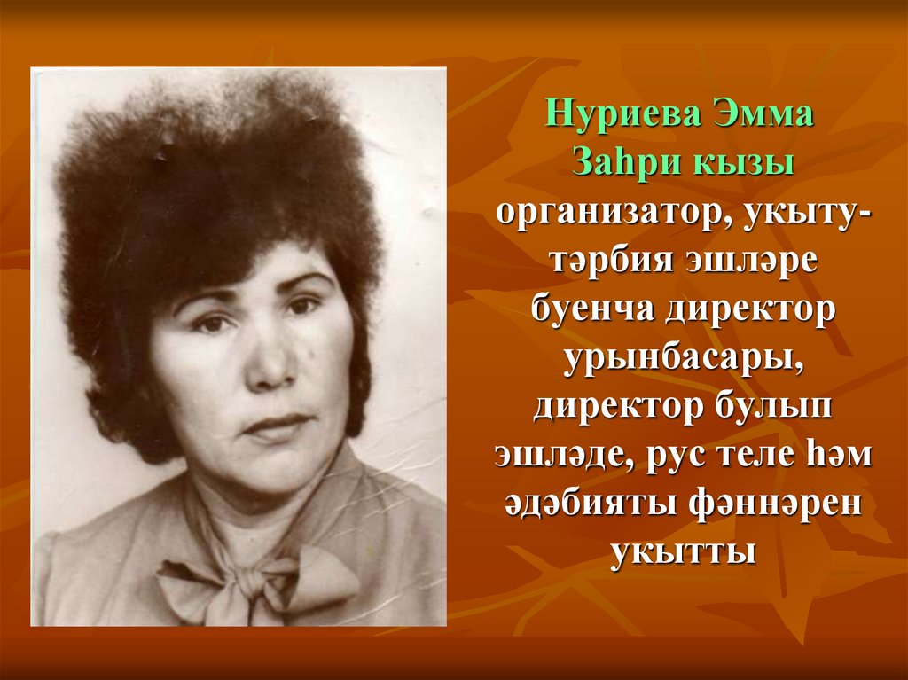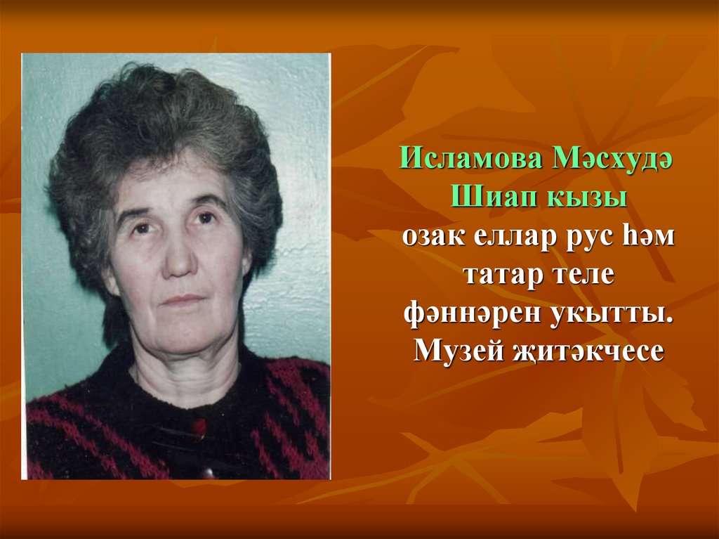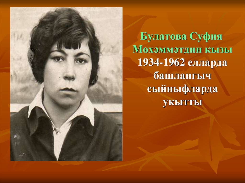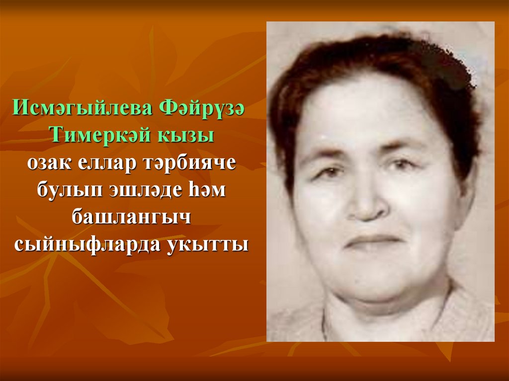 25. Исмәгыйлова Зәйтүнә Абдулла кызы озак еллар татар теле һәм әдәбияты укытучысы булып эшләде