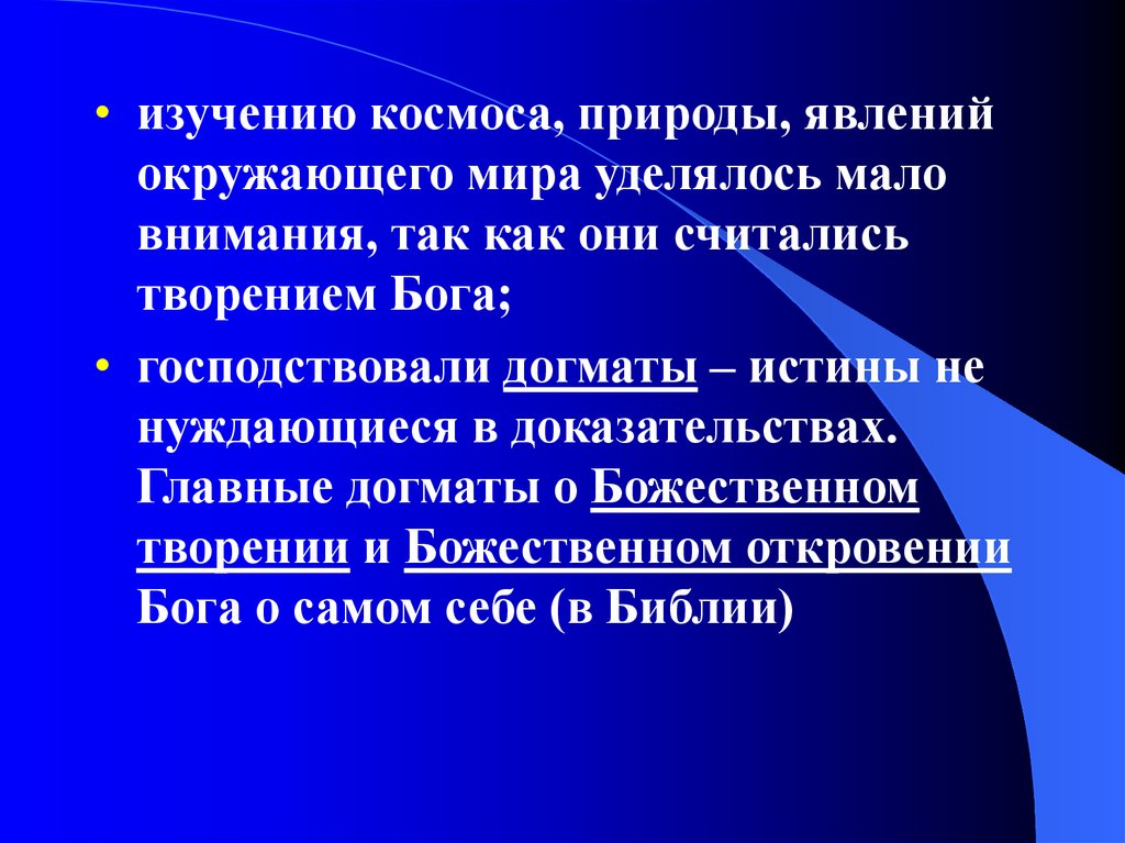 • изучению космоса, природы, явленийокружающего мира уделялось мало