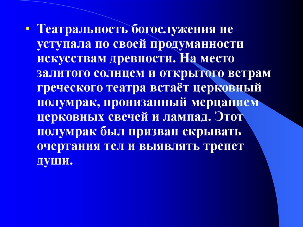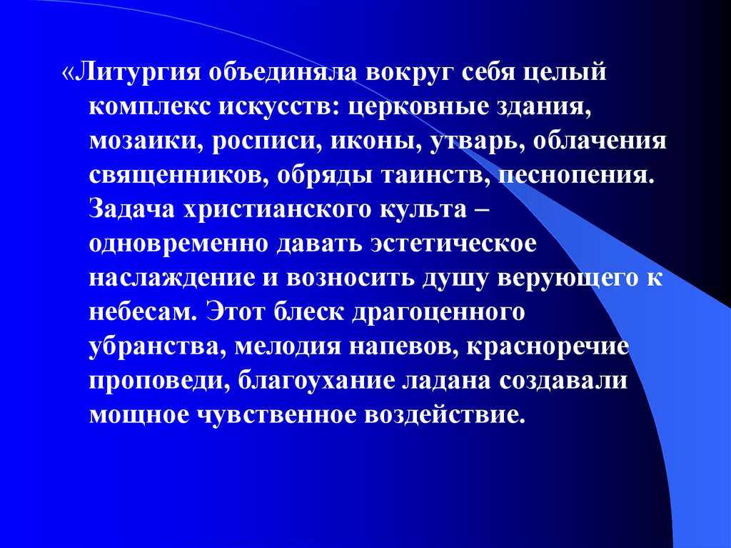 «Литургия объединяла вокруг себя целыйкомплекс искусств: церковные здания,