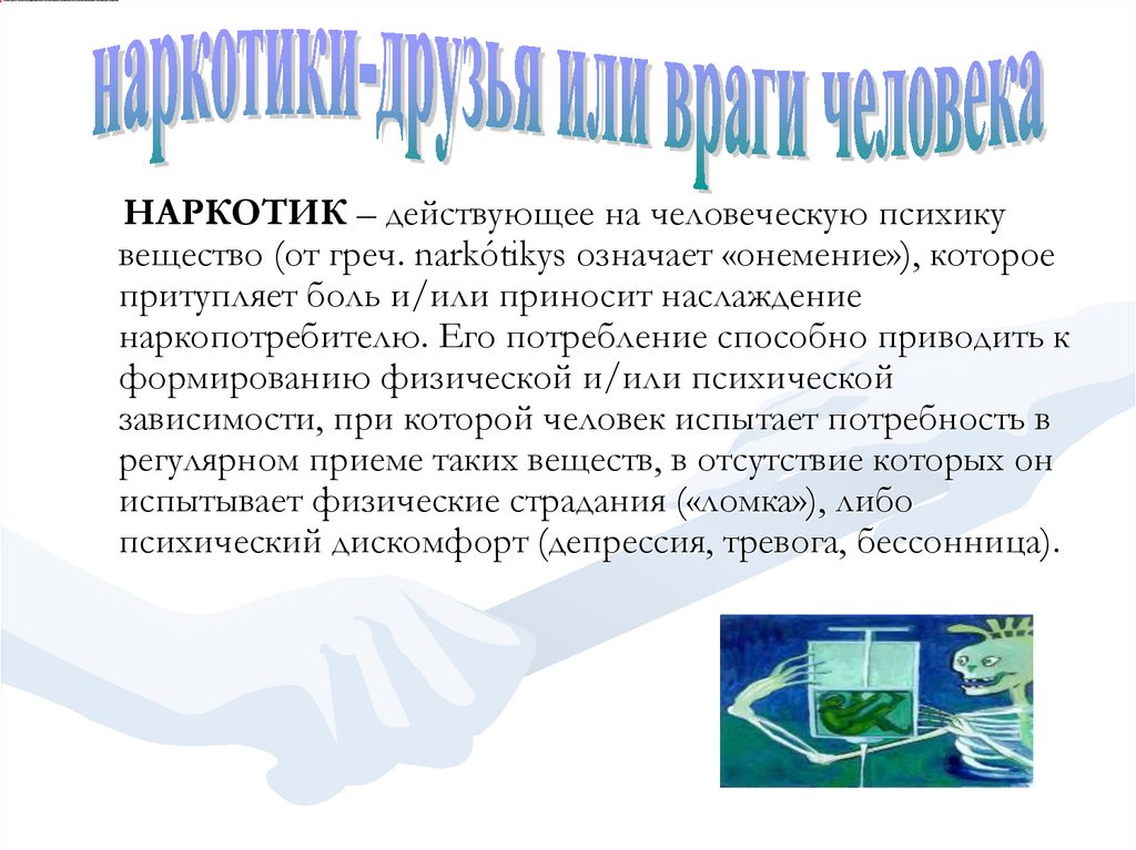 НАРКОТИК – действующее на человеческую психикувещество (от греч. narkótikуs означает «онемение»), которое