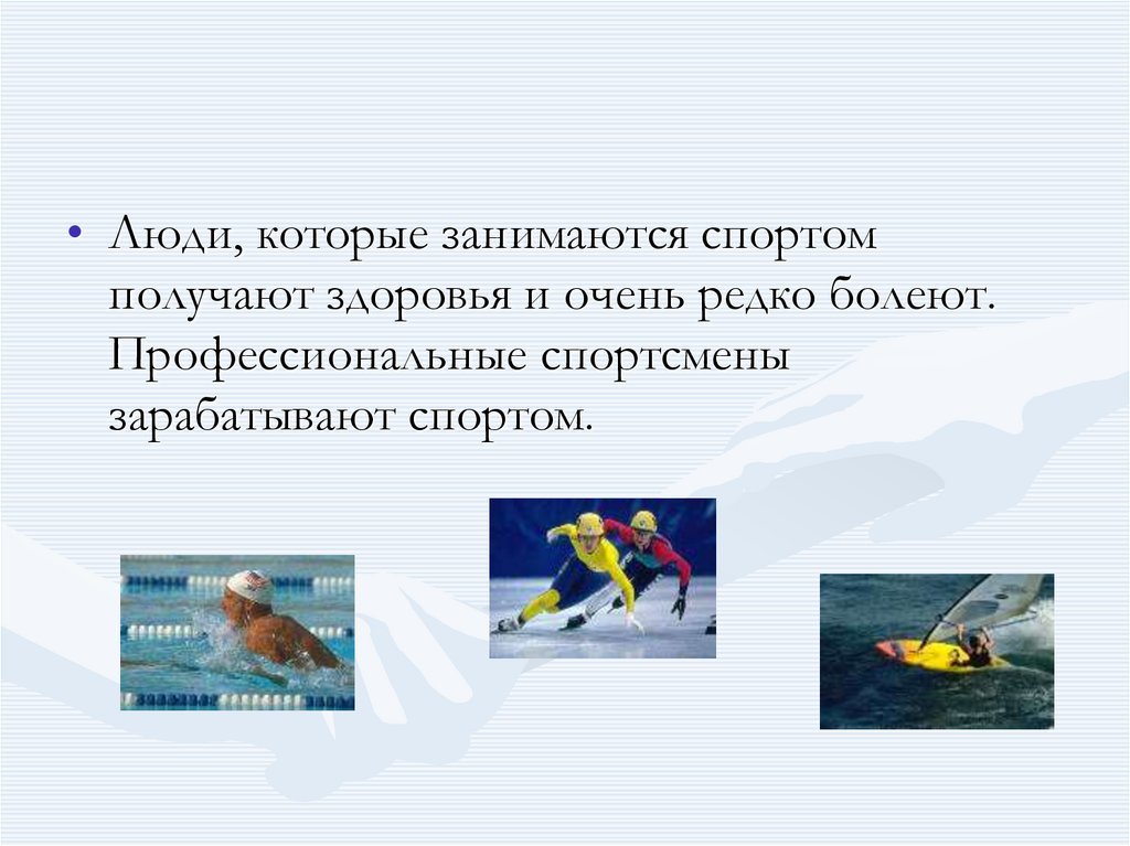 • Люди, которые занимаются спортомполучают здоровья и очень редко болеют.