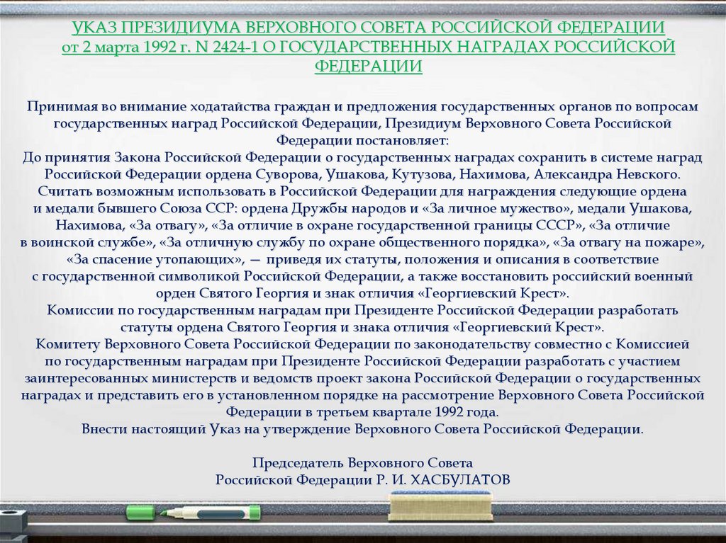 УКАЗ ПРЕЗИДИУМА ВЕРХОВНОГО СОВЕТА РОССИЙСКОЙ ФЕДЕРАЦИИот 2 марта 1992 г. N 2424-1 О ГОСУДАРСТВЕННЫХ НАГРАДАХ РОССИЙСКОЙ
