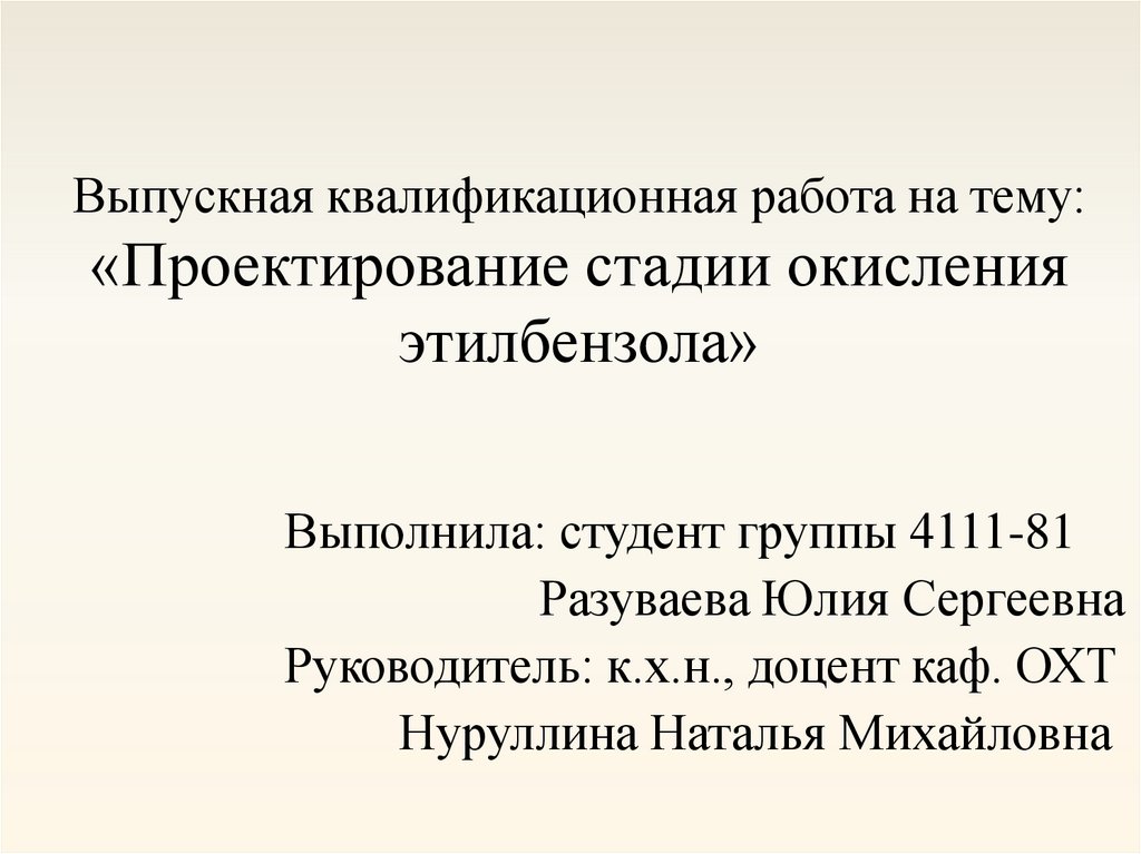 1. Выпускная квалификационная работа на тему: «Проектирование стадии окисления этилбензола»