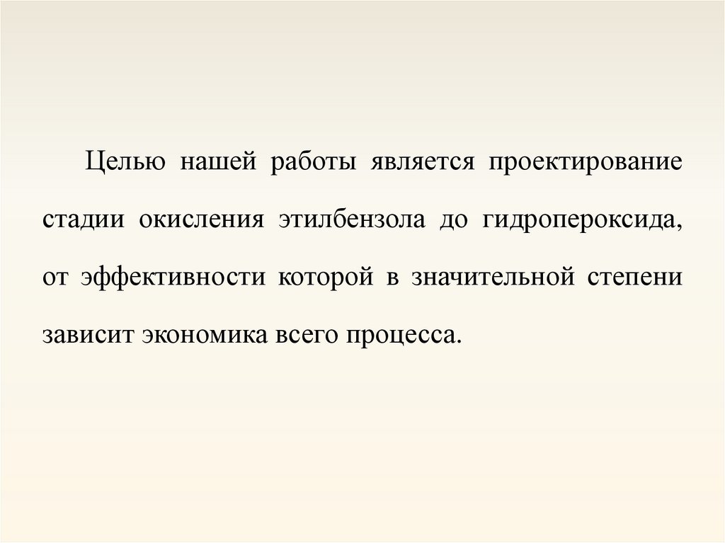 Целью нашей работы является проектированиестадии окисления этилбензола до гидропероксида,