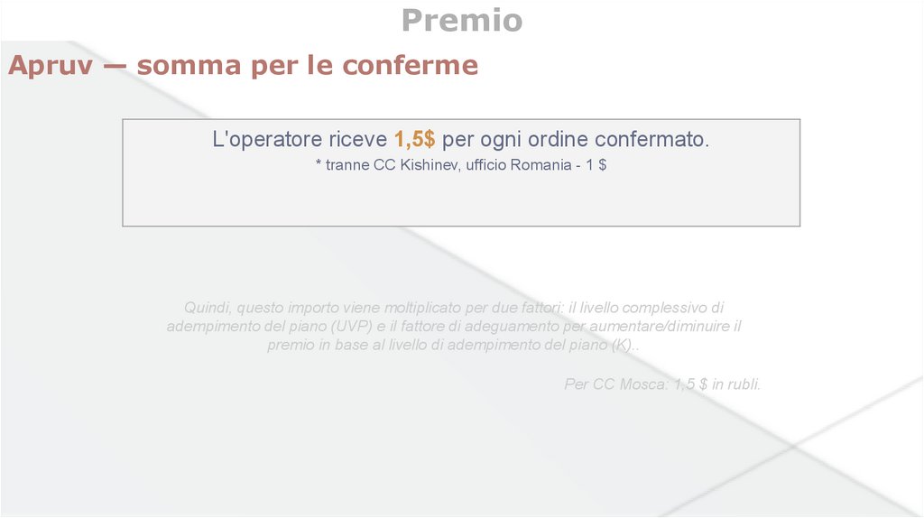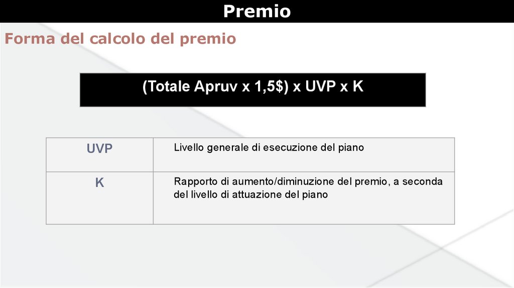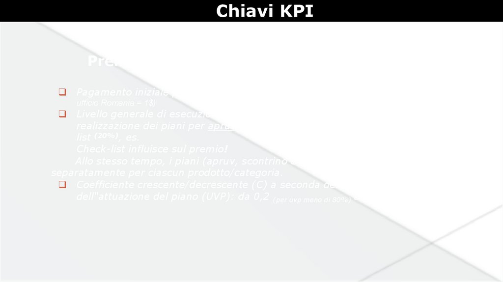 Chiavi KPIPremio = (Somma apruv x 1,5$) x UVP x C.