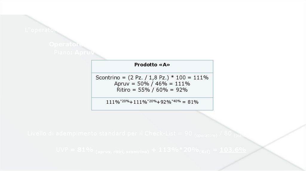 Scontrino = (2 pz. / 1,8 pz.) * 100 = 111%