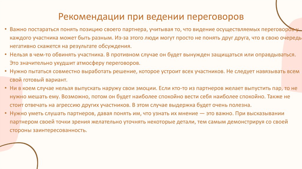 Рекомендации при ведении переговоров• Важно постараться понять позицию своего партнера, учитывая то, что видение осуществляемых переговоров у