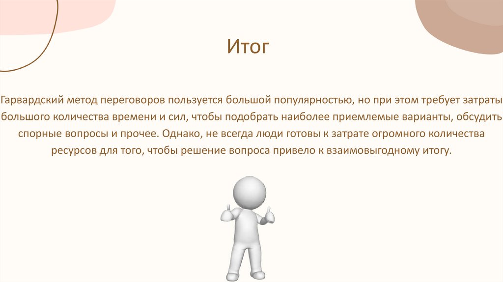 ИтогГарвардский метод переговоров пользуется большой популярностью, но при этом требует затраты