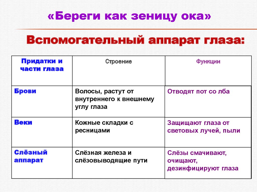«Береги как зеницу ока»Вспомогательный аппарат глаза: