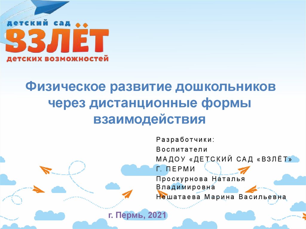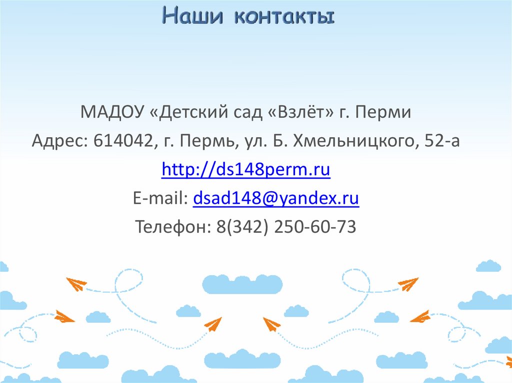 МАДОУ «Детский сад «Взлёт» г. ПермиАдрес: 614042, г. Пермь, ул. Б. Хмельницкого, 52-а