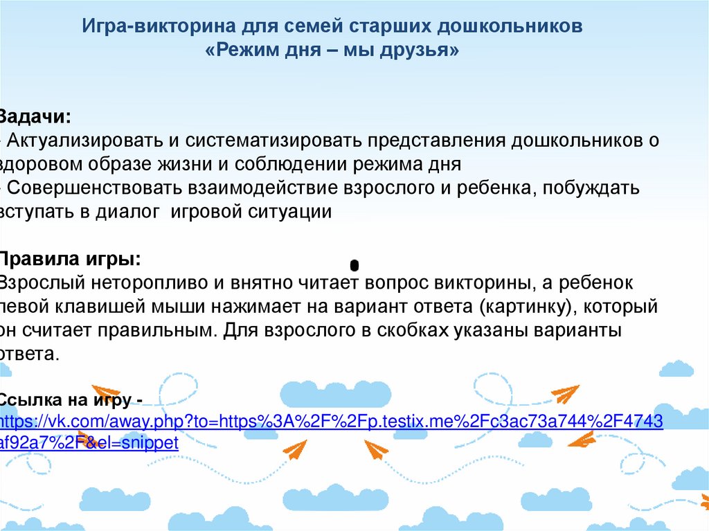 Игра-викторина для семей старших дошкольников«Режим дня – мы друзья»