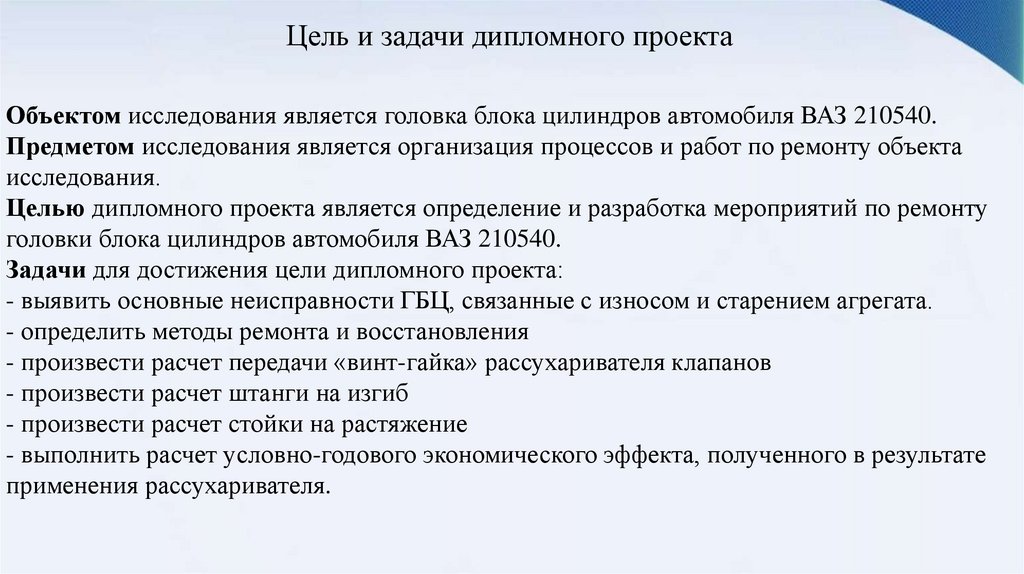 Цель и задачи дипломного проектаОбъектом исследования является головка блока цилиндров автомобиля ВАЗ 210540.