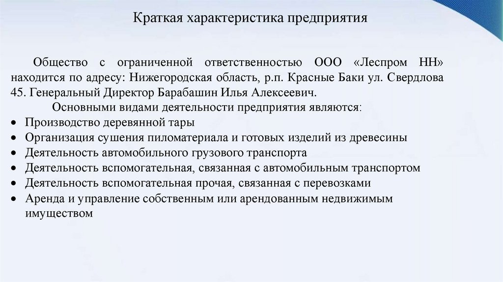 Краткая характеристика предприятияОбщество с ограниченной ответственностью ООО «Леспром НН»