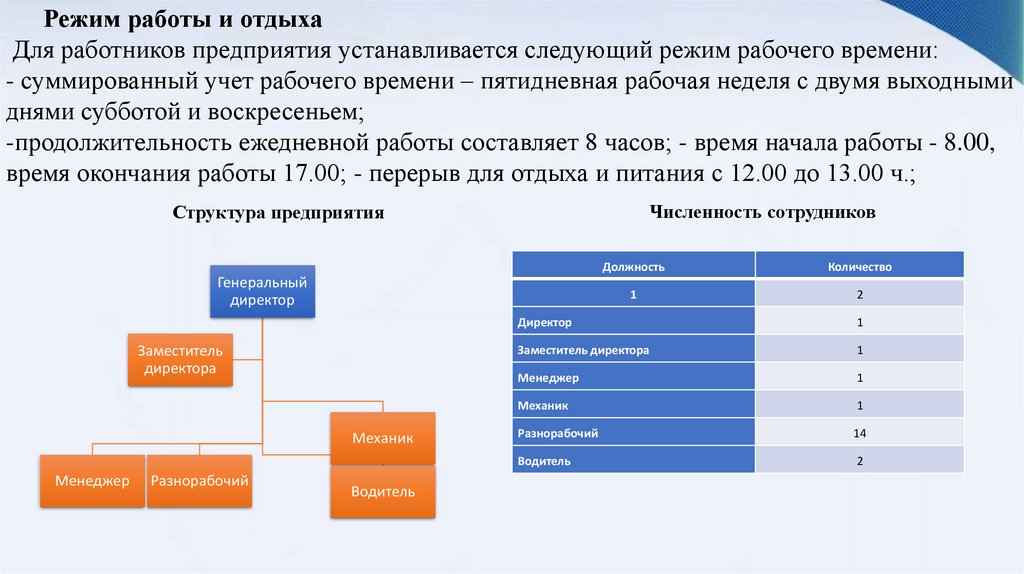 Режим работы и отдыхаДля работников предприятия устанавливается следующий режим рабочего времени:
