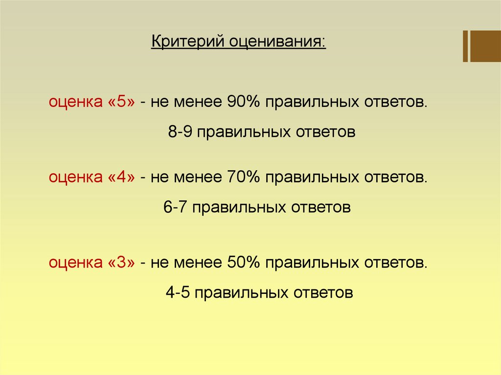 Критерий оценивания:оценка «5» - не менее 90% правильных ответов.