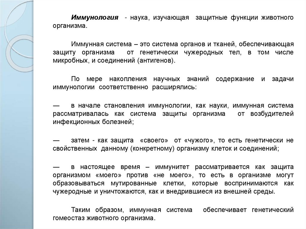 Иммунология - наука, изучающая защитные функции животногоорганизма.