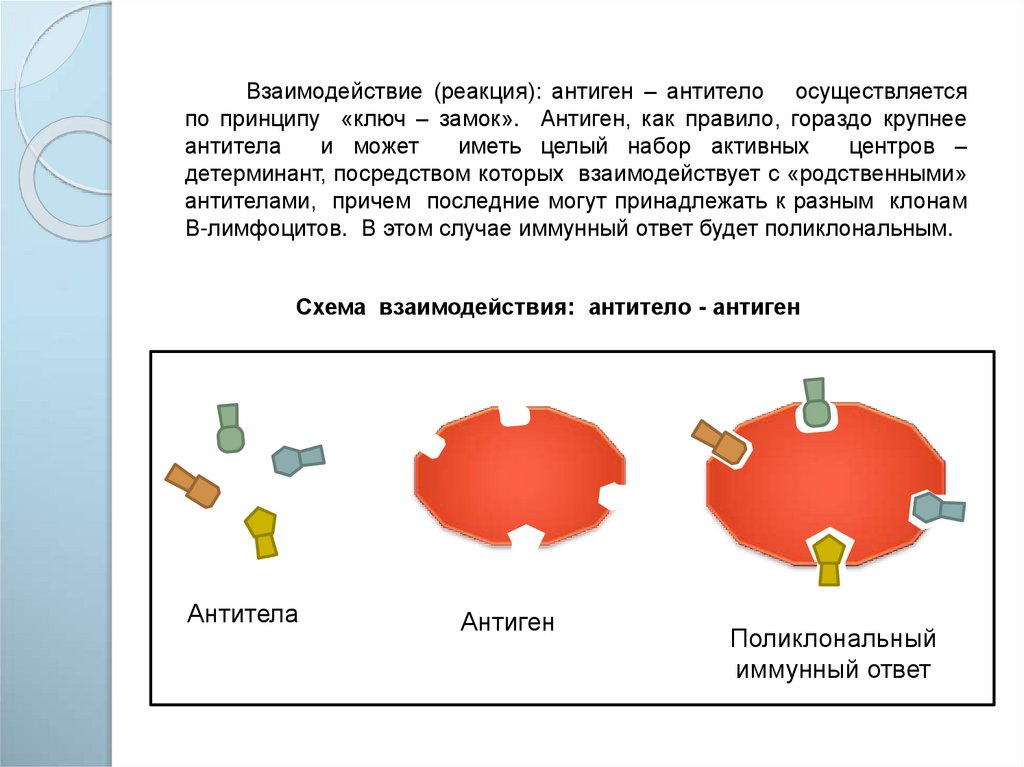 Взаимодействие (реакция): антиген – антитело осуществляетсяпо принципу «ключ – замок». Антиген, как правило, гораздо крупнее