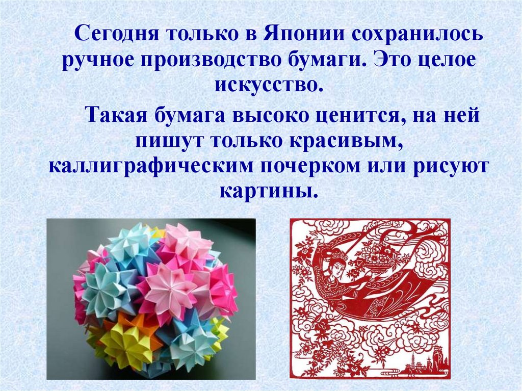 Сегодня только в Японии сохранилосьручное производство бумаги. Это целое