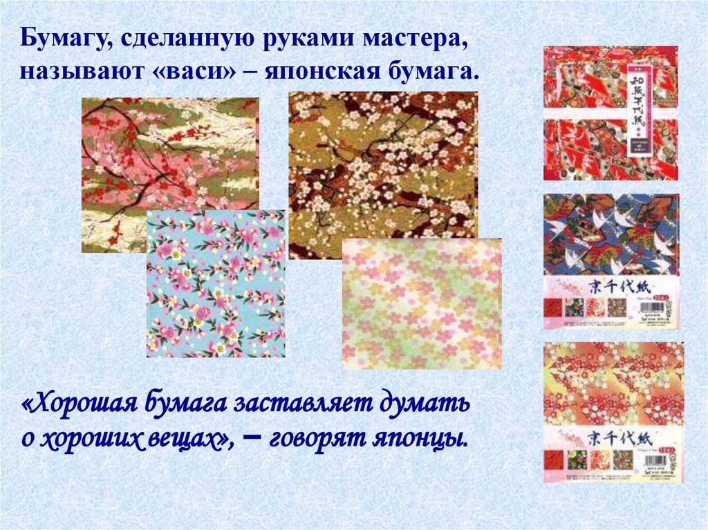 Бумагу, сделанную руками мастера,называют «васи» – японская бумага.