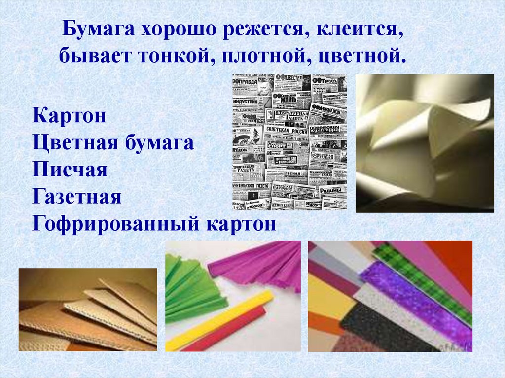 Бумага хорошо режется, клеится,бывает тонкой, плотной, цветной.